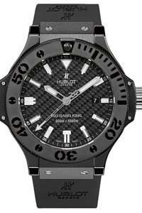 Ceramic case with a rubber - black strap. Black ceramic bezel. Carbon fiber dial with luminous hands and index hour markers. Minute markers around the outer rim. Dial Type: Analog. Date display appears at the 3 o'clock position. Automatic movement. Scratch resistant sapphire crystal. Screw-down crown with rubber insert. Case diameter: 48 mm. Push-button foldover clasp. Water resistant at 3000 meters / 1000 feet. Functions: hours, minutes, seconds, calendar. Luxury watch style. Hublot Big Bang King Carbon Fiber Mens Watch 322CM1770RX.